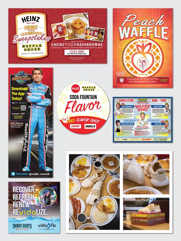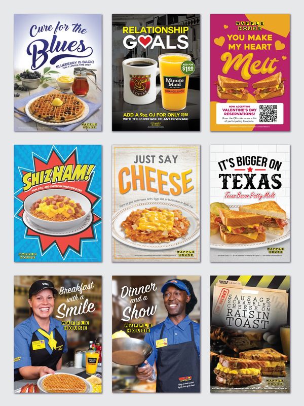 Every design project begins with a brief of desired marketable aspects of a business. For Waffle House, the food, the associates, and the experience are the main key points. A creative meeting is held to bounce ideas off of different people with unique perspectives along with AI, collaborating to find the best possible catchy headline, imagery, layout or theme. Food and people photography is then scheduled (if the shot has not already been taken). With these elements supplied, I then bring the vision to life with thoughtful design focusing on every aspect (colors, photography, fonts, messaging, background, etc) that best communicates to the viewer. These are examples of some of the more whimsical pieces that fit the Waffle House brand!